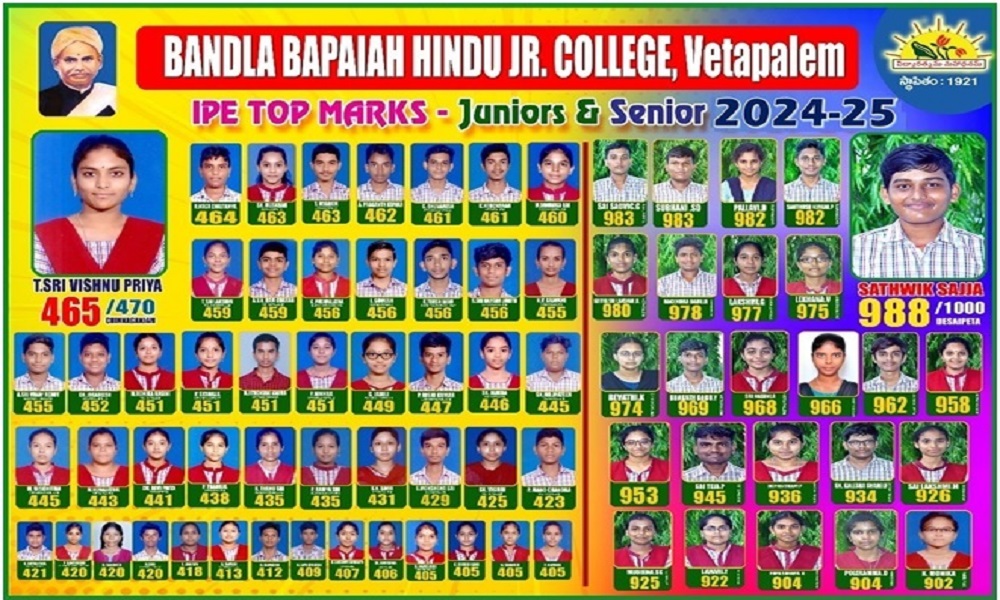 • 1st Year: Sajja Sathwik Venkata Siva Datta Kumar 465/470 (District first and state 4th ranker)